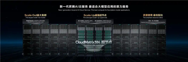这就是CloudMatrix384超节点,这玩意已经能把384颗昇腾NPU,和192颗鲲鹏CPU连起来了。前几天华为开发者大会2025(HDC 2025)上,华为云放还出了基于CloudMatrix 384超节点的最新的昇腾云服务。